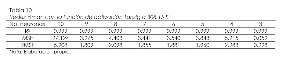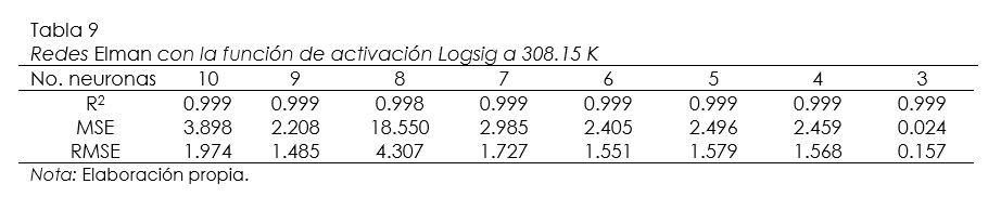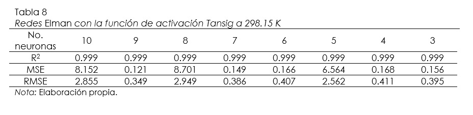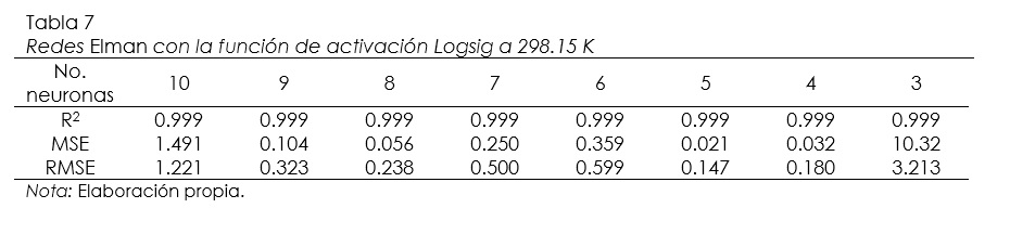 En las tablas 7-10 se muestran los resultados de R2, MSE y RMSE que se obtuvieron con las redes neuronales Elman Backprop con la función de activación Logsig y Tansig, respectivamente, en la predicción de los parámetros QSAR a 298.15 y 308.15 K.