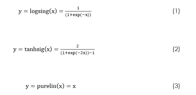 Las redes Feedforward y las redes Elman utilizan la función sigmoidea como función de activación en el entrenamiento y construcción de las redes neuronales, debido a que presenta un equilibrio entre el comportamiento lineal y no lineal (Kermani, Schiffman, & Nagle, 2005). La función de activación logarítmica sigmoidea está representada por la ecuación 1 y la tangente hiperbólica sigmoidea, en donde el comportamiento está descrito mediante la ecuación 2 en la capa oculta; mientras que la función de transferencia lineal purelin (ecuación 3) se utilizó para la capa de salida.