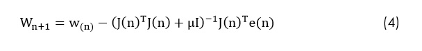 El algoritmo de entrenamiento utilizado para ambas redes fue el de Levenberg-Marquardt debido a su gran estabilidad y alta capacidad de convergencia en el entrenamiento de redes neuronales (Gupta & Bhattacharyya, 2006). Este algoritmo genera modelos con grandes índices de correlación debido a su capacidad de minimizar el error cuadrático medio. El algoritmo de Levenberg-Marquardt es una modificación del método de Gauss-Newton (ecuación 4).