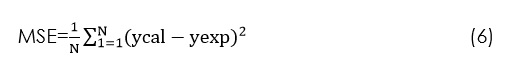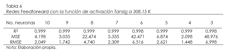 En las tablas 3 y 4 se apreció que la red con seis neuronas en la capa oculta y la función de activación Logsig presentó un menor error cuadrático medio (MSE) de 0.129; por tanto, tuvo una mejor predicción de los parámetros QSAR; mientras que en las tablas 5 y 6 se aprecian los coeficientes de determinación y los respectivos de errores de la red Feedforward a una temperatura de 308.15 K, en donde la red con seis neuronas en la capa oculta y una función de activación Logsig presentó un menor MSE; es decir, es el modelo que tiene una mejor predicción de los QSAR.