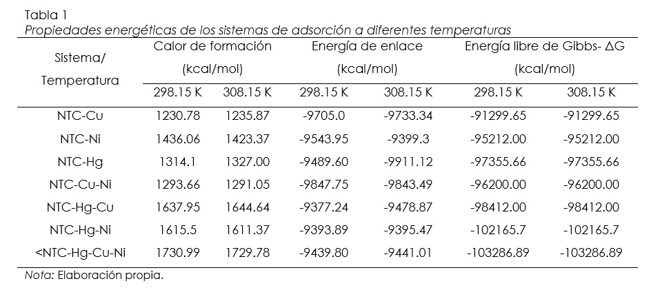 En la tabla 1 se aprecian los calores de formación y las energías de enlace y Gibbs de los sistemas de adsorción a 298.15 y 308.15 K, respectivamente; en donde se observó que todos los sistemas de adsorción fueron endotérmicos y espontáneos (Meek, Teich-McGoldrick, Pery, Greathouse, & Allendorf, 2012); por otra parte, las energías de enlace fueron negativas; es decir, existe una estabilidad de los sistemas mono y multicomponente. Además, se apreció una energía de enlace más negativa en el sistema NTC-Hg; es decir, es el sistema más estable, mientras que en los sistemas multicomponente esta energía disminuye debido a la presencia de los iones metálicos.