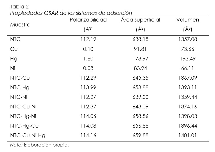 Las propiedades QSAR (tabla 2) indicaron que las moléculas individuales de los metales pesados tienen una baja polarizabilidad debido a que la separación entre sus orbitales fronteras es mayor; sin embargo, los electrones del doble enlace C=C presente en el NTC podrán separase con mayor facilidad del átomo, dando lugar a la unión de los sitios de adsorción (Rozylo, Malinowska, & Poniewaz, 1984). Este parámetro muestra las posibles interacciones entre átomos y moléculas no polares, iones y moléculas polares con momentos dipolares. El sistema NTC-Cu-Hg-Ni presentó mayores valores de área de superficie y volumen, 658.86 Å2 y 1401.01 Å3, respectivamente; por otro lado, el área de superficie de cualquier material adsorbente dependerá principalmente del número de poros que contenga, cuanto mayor sea ese número mayor superficie se tendrá para que se lleve a cabo la adsorción en el material adsorbente. Del mismo modo ocurre con el volumen (Allred, 1961); debido al tamaño y al número de átomos que constituyen el CNT esta área de superficie es mayor que los átomos de metales pesados.