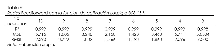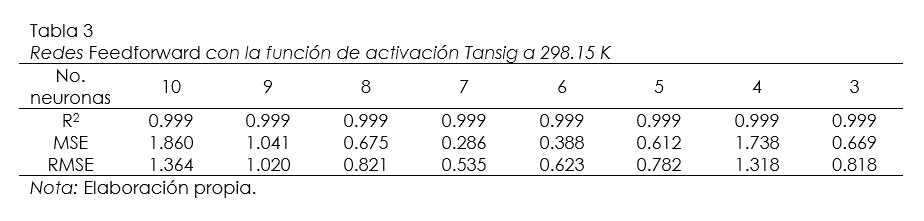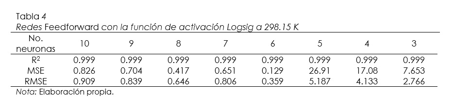Las tablas 3-6 muestran los resultados de los parámetros estadísticos R2, MSE y RMSE que se obtuvieron con la red neuronal Feedforward con la función de activación Tansig y Logsig, respectivamente, mediante el análisis de los parámetros QSAR a 298.15 y 308.15 K.