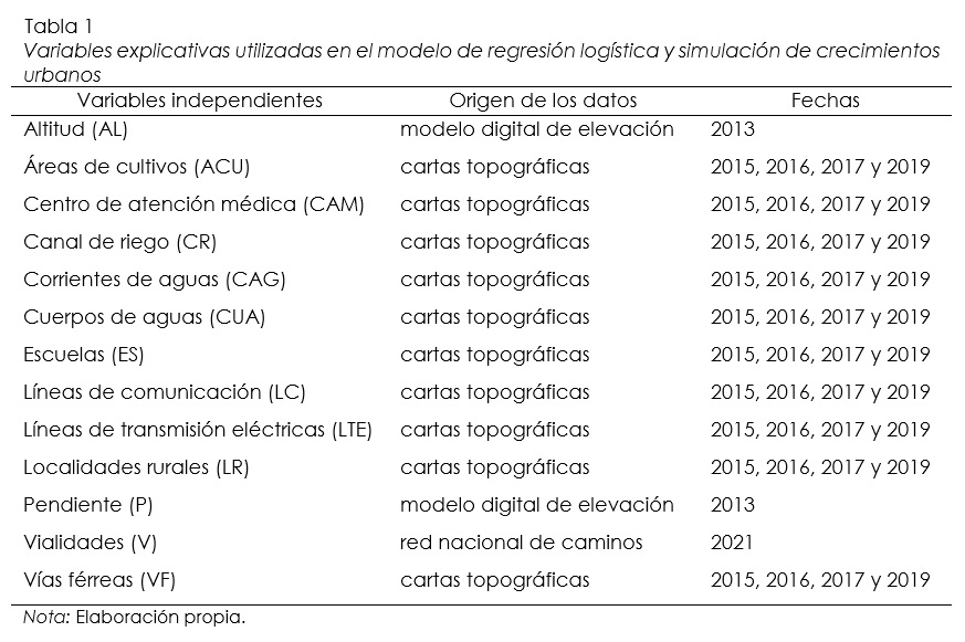 Se empleó RL con datos de 2010 y 2020 para identificar la relación entre el crecimiento urbano y los factores explicativos y modelar el crecimiento de las ciudades pertenecientes a las zonas urbanas de la cuenca Laguna Bustillos y de los Mexicanos, río Conchos-Ojinaga, río Conchos-Presa de la Colina, río Conchos-Presa el Granero y río San Pedro, en un entorno Sistema de Información Geográfica. De las variables o factores explicativos de este fenómeno de expansión urbana se consideró como variables independientes información obtenida de la carta topográfica escala 1:50 000, Red Nacional de Caminos, Marco Geoestadístico y Centro de Población y Vivienda 2020 de INEGI; recopilando un total de 14 variables de tipo socioeconómico, proximidad/accesibilidad, ambientales y de tipo físico (tabla 1).