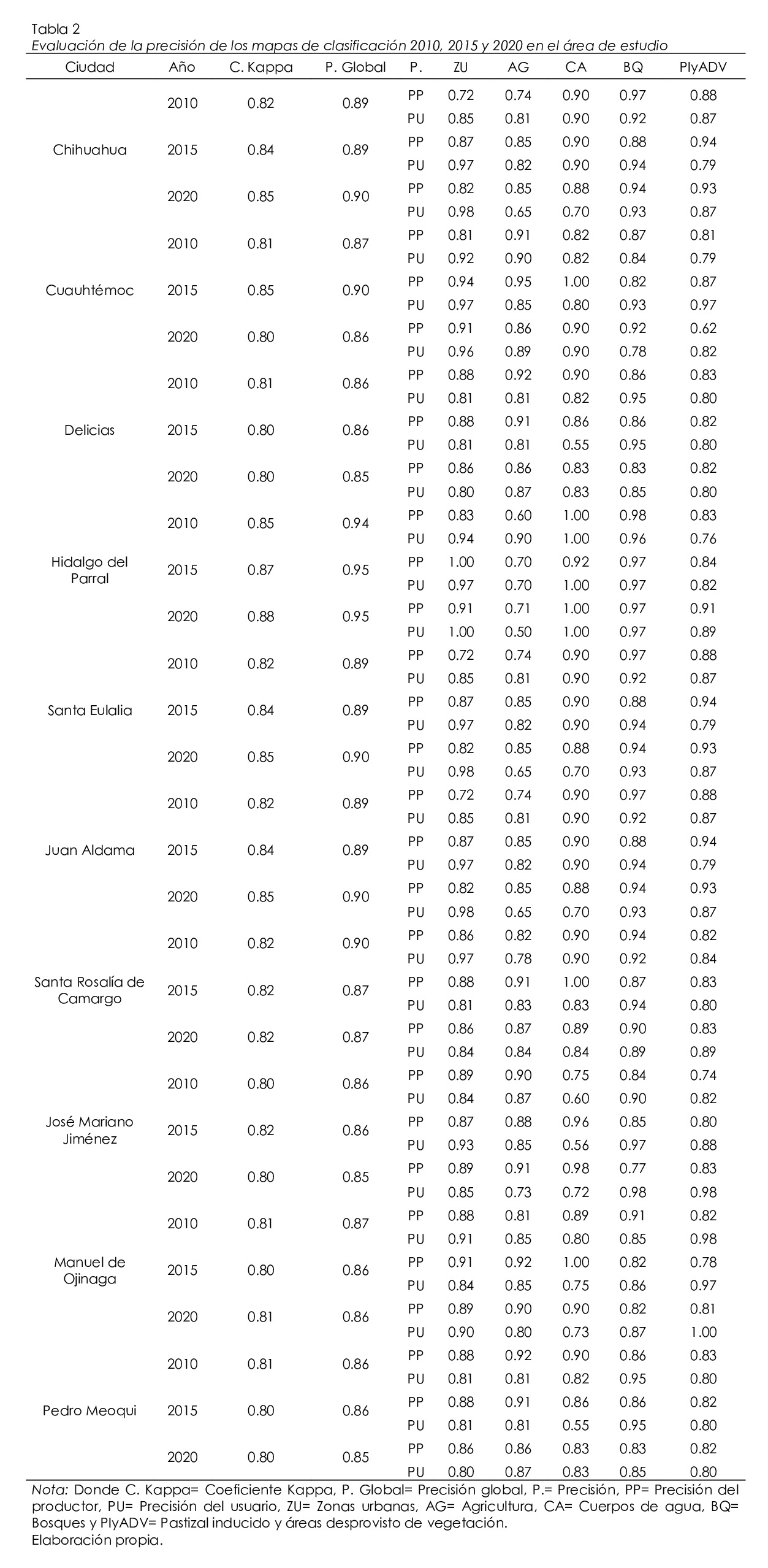 La tabla 2 muestra los coeficientes Kappa y la precisión global derivada del método de muestreo aleatorio estratificado. Para las imágenes clasificadas de los años 2010, 2015 y 2020 y para las diez ciudades los coeficientes Kappa mostraron valores altos de precisión; respecto a la precisión global fueron muy buenos. En cuanto a la precisión del productor y usuarios los valores fueron aceptables en todas las clases.