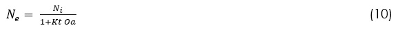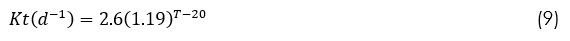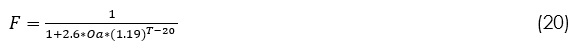 Para simplificar el cálculo de los coliformes en el efluente, se relacionan las variables independientes de tiempo de retención (Oa) y temperatura (T) con el factor de decaimiento (F). Este factor de decaimiento (ecuación 19) es el primer término de la ecuación (18), la cual se toma de la ecuación (10):