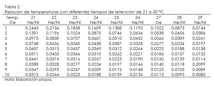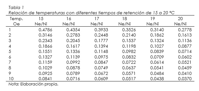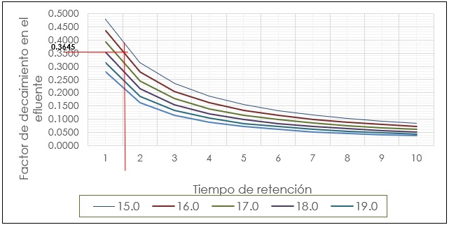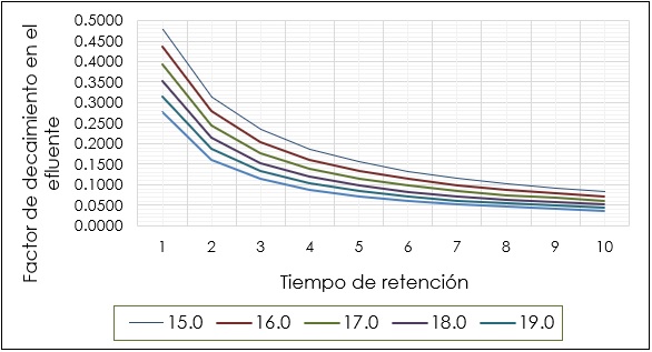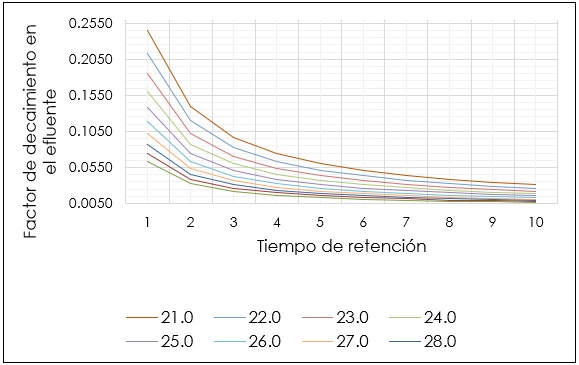 Con la expresión (20) se calcula el factor de decaimiento de los coliformes fecales (F) con diferentes rangos de temperatura y tiempos de retención. En la tabla 1 se muestra el cálculo del factor. En las tablas 1 y 2 ya editadas se muestran los resultados.