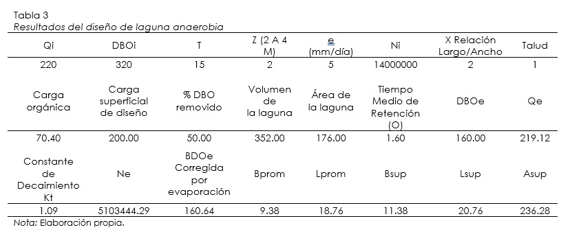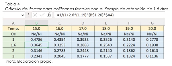 Es importante indicar que el remanente de coliformes fecales deberá ser tratado con lagunas anaerobias y de maduración, el presente estudio sólo incluye lagunas anaerobias. Por otro lado, debe existir un tratamiento preliminar para el desbaste primario; es decir, la retención de sólidos gruesos, así como canales desarenadores para que posteriormente el agua residual puede ingresar a la laguna anaerobia. Para comprobar el resultado del factor que indica el método gráfico se introduce en la tabla de cálculo en Excel el tiempo de retención de 1.6 días, la tabla 4 muestra el resultado.