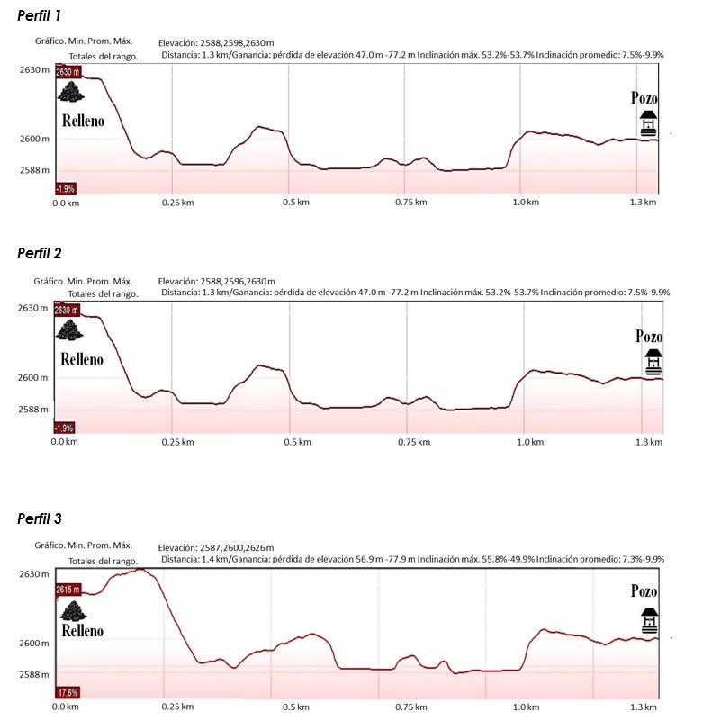 La DBO (4.45 mg/l O2) y la DQO (9.25 mg/l O2) demuestran la infiltración de los lixiviados procedentes del RS, con un índice de biodegradabilidad de 0.48. La presencia de turbidez (0.26 UTN) y color (1 U Pt-Co), aunque es bajo, es atípico del agua. La presencia de coliformes es de 20 UFC/100 ml, sobrepasa la NOM-127-SSA1-2021 (Secretaría de Salud, 22 de noviembre de 2000), lo que corrobora la infiltración de los lixiviados. Los resultados demostraron una permeabilidad de los lixiviados en agua y suelo con respecto a la materia orgánica y nitrogenada. La figura 2 muestra los perfiles de altitud entre el pozo evaluado y el RS, con una distancia promedio de 1.38 km y una diferencia de altitud entre 28 y 10 m, ubicando la disposición de los RSU a una mayor altura con respecto al pozo; lo que confirma su contaminación, debido a la cercanía y la diferencia de alturas que favorecen el flujo de los lixiviados en dirección al pozo (Parvin & Tareq, 2021).