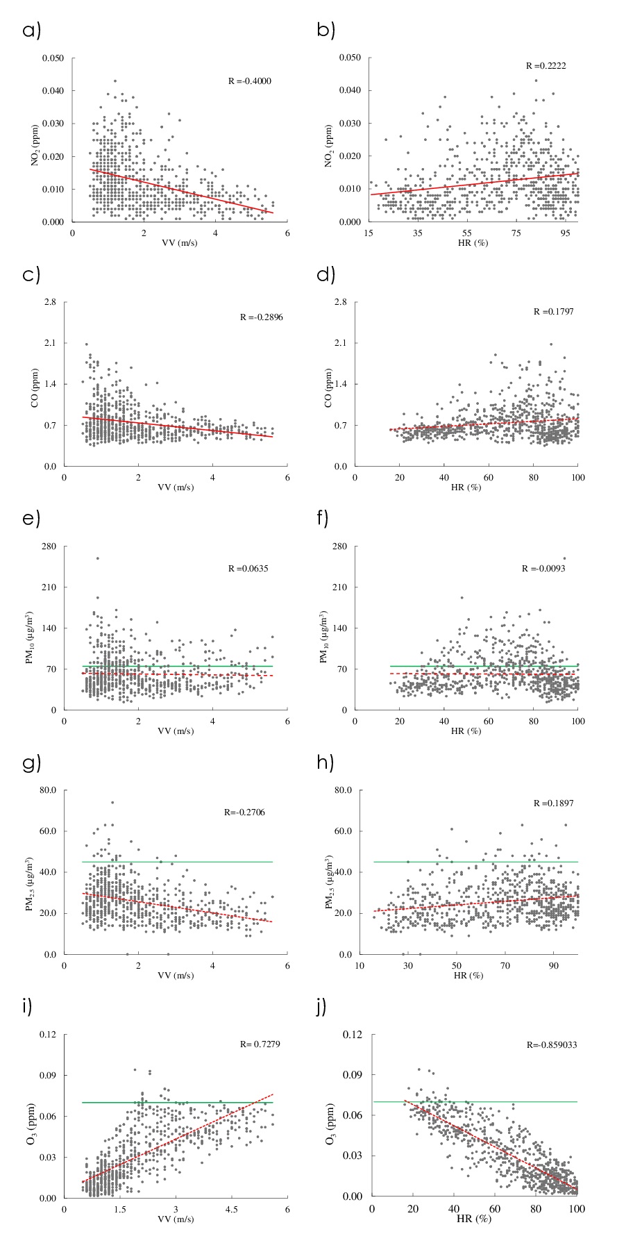Los coeficientes de correlación entre las concentraciones de O3 y las condiciones climáticas (VV y HR) tienen una correlación moderadamente fuerte (figura 3 incisos i a j); al aumentar la VV el O3 incrementa y al aumentar la HR la concentración disminuye. El O3 en la atmósfera está estrechamente relacionado con las condiciones climáticas que pueden contribuir a disipar o incrementar sus valores. El límite de acuerdo con la NOM-020-SSA1-2014 (Secretaría de Salud, 19 de agosto de 2014) es 0.07 ppm y 0.06 ppm conforme a la directiva del Parlamento Europeo 2008/50/CE (Unión Europea, 2008).