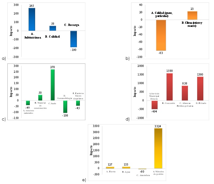 Con la matriz de Leopold se evaluó cualitativa y cuantitativamente las características físicas y químicas del agua, suelo y aire; así como la aplicación del método de gestión integral utilizado (ver anexo). En la figura 4 inciso a se muestra el principal efecto negativo en la recarga del agua subterránea debido al proceso de extracción (10.6 l/s) en el pozo y abastecimiento de la zona (-190). Aunque en la caracterización fisicoquímica del agua presenta cambios significativos debido a la incorporación de materia orgánica (DQO y DBO) y nutrientes (P y N), estos no se reflejan en la matriz causa-efecto debido a que estos parámetros generalmente no se determinan en agua de consumo; además de que la NOM-127-SSA1-2021 Agua Para Uso y Consumo Humano. Límites Permisibles De La Calidad Del Agua (Secretaría de Salud, 6 de diciembre de 2019; 22 de noviembre de 2000; 2 de mayo de 2022) no considera los parámetros orgánicos. Ma et al. (2022) encontraron concentraciones de DQO, N-NH4+, metales pesados, (Mn, Cd, Ni) y el metaloide As en agua del pozo cercano al RS. En la figura 4 inciso b se muestra el principal efecto en el aire a causa de gases y partículas (-86) asociados al relleno sanitario, la descomposición de la materia orgánica y la extracción de materiales de construcción en la zona. Además, en el RS se carece de la captación y aprovechamiento energético del biogás y existe poca vegetación y reforestación en el área. En la figura 4 inciso c se muestra el mayor impacto asociado a la geomorfología (-108), a los factores físicos singulares (-45), materiales de construcción y recursos minerales (-40) debido a la alteración de la cubierta terrestre, excavación en el sitio, extracción de materiales pétreos para construcción; así como el uso del suelo para disposición final RSU; adicionalmente es una zona agrícola con impacto por el uso de plaguicidas y fertilizantes químicos, con alto crecimiento y desarrollo habitacional. La muestra de suelo más cercano al RS está contaminada en comparación con las muestras de suelo más alejadas debido al alto contenido de materia orgánica y metales pesados (Ingle, 2022). El lixiviado contiene la mayor concentración de metales pesados, DBO y DQO; si se permite que el lixiviado drene hacia las aguas superficiales o se infiltre en las aguas subterráneas puede provocar efectos adversos en la salud humana y el ambiente. En la figura 4 inciso d se muestran los impactos del método de gestión, siendo el de mayor efecto negativo el servicio municipal directo (-969) debido a que se carece de una gestión adecuada de los RSU desde la recolección, almacenamiento y manejo; así como a una limitada capacidad de inversión municipal y falta de seguimiento de políticas públicas para el manejo de RSU. La concesión es el sistema de gestión de mayor impacto positivo (1580) debido a que la ejecución de este sistema presenta mejor organización, manejo de los RSU y calidad del servicio. En la figura 4 inciso e se muestra los efectos sobre las distintas esferas ambientales: atmósfera (-60), suelo (62), agua (128) y métodos de gestión (2844). La atmósfera es la que mayor impacto recibe debido a gases y partículas emitidas por la descomposición de materia orgánica en el RS; además fuentes externas al RS como extracción de materiales pétreos para la construcción, la zona agrícola donde se usan plaguicidas y los desarrollos habitacionales incrementan el impacto sobre la atmósfera.