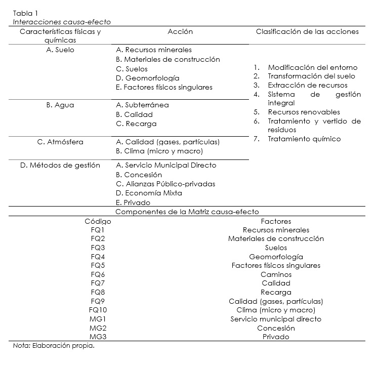 La información del lixiviado, agua de pozo, suelo y aire se integró para calcular los sistemas de gestión integral (SGI) y se establecieron los factores ambientales que mostraron los impactos sobre el agua, la atmósfera y el suelo (Araiza Aguilar et al., 2018). En la tabla 1 se muestran las interacciones causa–efecto y los componentes de la matriz.