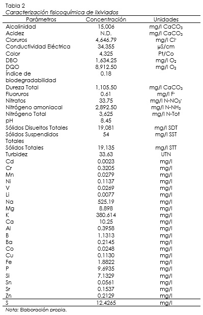 Los lixiviados presentan valores de DBO 1,634.25 mg/l O2; DQO 8912.50 mg/l O2, con una relación DBO/DQO de 0.18, que señalan alta carga de compuestos orgánicos de elevado peso molecular, característicos de los lixiviados maduros y por ICP se detectan metales pesados. Se presentó una concentración significativa de nitrógeno amoniacal 2,892.50 mg/l N-NH3; nitratos 33.75 mg/l N-NO3- y nitrógeno total 3,625 mg/l N-Tot. La concentración de 4,646.79 mg/l Cl- puede representar fuerte contaminación y ser indicativo de una infiltración reciente de lixiviados en las aguas subterráneas, debido a que se encontró DQO, DBO, NO3- principalmente en la época de recarga.
