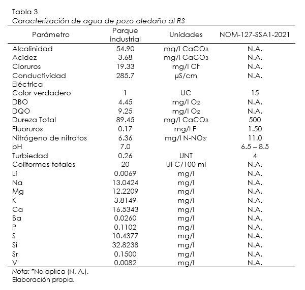 Se tomó una muestra de agua de pozo cercano al RS (1.4 km) (NOM-014-SSA1-1993) y se caracterizó mediante análisis elemental Plasma de Acoplamiento Inductivo-Masas (ICP-MS) mediante un espectrómetro modelo iCAP Qc marca Thermo Scientific y los parámetros fisicoquímicos pH (NMX-AA-008-SCFI-2016), conductividad eléctrica (NMX-AA-093-SCFI-2018), sólidos disueltos (NMX-AA-034-SCFI-2015), cloruros (NMX-AA-073-SCFI-2001), sulfatos (NMX-AA-074-SCFI-2001), alcalinidad y acidez (NMX-AA-036-SCFI-2001), fosfatos (NMX-AA-029-SCFI-2001), DQO, NMX-AA-030/2-SCFI-2012), COT (método Hach 10173), DBO (NMX-AA-028-SCF1-2001) y parámetros microbiológicos (NOM-113-SSA1-1994).