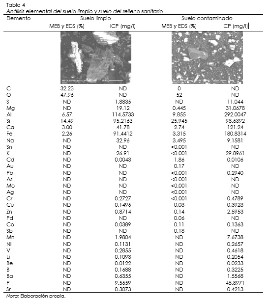 La tabla 4 muestra la composición del suelo limpio donde se observa alto porcentaje de C (32.23%) y O (47.96%), de la materia orgánica y minerales como Al, Si, Ca, y Fe. El suelo contaminado carece de C, lo que indica un suelo mineralizado con mayor concentración de O (52%), Si (25.95%), Al (9.86%) y Fe (3.32%). Los metales en menor concentración son Na, Cd, Au, Zn, Co, Cu y se identifican por ICP trazas de elementos como Al (292.0047 mg/l), Fe (180.8314 mg/l), Ca (121.24 mg/l), P (45.8971 mg/l), K (29.8961 mg/l), Mg (31.0678 mg/l), S (11.044 mg/l), Na (9.1581 mg/l), Zn (2.5953 mg/l), Ba (1.5568) y metales pesados Cr (0.4789 mg/l), V (0.4618), Cu (0.3923 mg/l), Pb (0.2940 mg/l), Ni (0.2657 mg/l) y Co (0.1363 mg/l), lo que demuestra que estos elementos se quedan retenidos en el suelo y/o probablemente se intercambien por Na (32.96 mg/l), cuya concentración inicial en el suelo limpio es mayor que en el suelo contaminado, lo que impide que las especies tóxicas migren. La morfología y el análisis MEB del suelo limpio indica presencia de partículas sólidas definidas y de mayor tamaño; mientras que el suelo contaminado contiene mayor mineralización, de estructura más particulada y fina que permite la retención de metales pesados provenientes de los lixiviados.