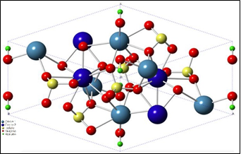 Se conocen dos estructuras cristalinas para Hap sintética: la fase hexagonal (grupo espacial p63/m) con parámetros de celda a= 9.4302 Å, c= 6.8911Å, γ= 120° y la estructura monoclínica (grupo espacial P21/b) con parámetros de celda a= 9.8421 Å, b= 2a, c= 6.8814 Å y γ= 120°; como se observa en la figura 1, la cual representa la fase hexagonal simulada con datos reales de sHap sintetizada por el método hidrotermal. En general, ambas estructuras se describen por la interacción de aniones tetraédricos (PO4_3) que están ordenados a lo largo del eje con cationes de Ca2+ en los sitios intersticiales y la diferencia entre ambas es la orientación del ion OH (Das & Pamu, 2019; Ferraz, Monteiro, & Manuel, 2004; Fihri, Len, Varma, & Solhy, 2017; Pai et al., 2020; Tõnsuaadu, Gross, Pluduma, & Veiderma, 2012).