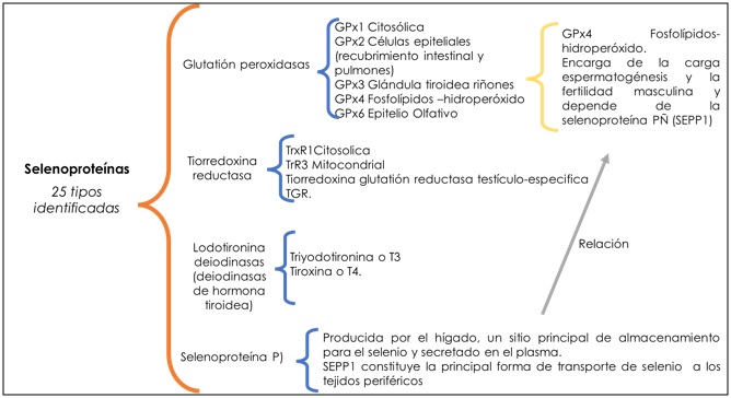 Por ejemplo, se conocen 25 genes que codifican las selenoproteínas identificadas en los humanos (Mariotti et al., 2012). Como se menciona en la figura 3, una de ellas es el glutatión peroxidasa, se compone de cinco enzimas GPx1-4 y GPx6. Las isoenzimas GPx son catalizadores antioxidantes que reducen a las especies reactivas de oxígeno potencialmente dañinas, como el peróxido de hidrógeno y los hidroperóxidos lipídicos en productos inocuos como el agua y los alcoholes.