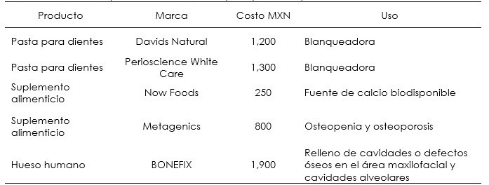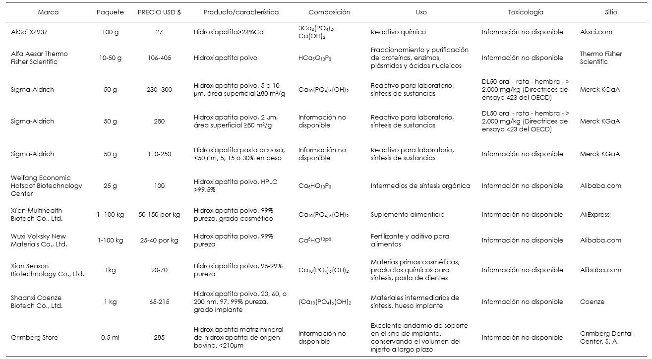 Actualmente la Hap se vende a nivel internacional, principalmente como reactivo químico para realizar síntesis de materiales, como fertilizante y uso cosmetológico; sin embargo, como se observa en la tabla 2 se hace una comparación entre ellas; destacan las que publicitan como hidroxiapatita; pero en su composición química, especificaciones y no poseer estudios de toxicología, pone en duda si realmente es el material mencionado. Por otra parte, se hace mención de otras, que por cuyas especificaciones y fichas de seguridad se comprueba la veracidad del producto y sugieren su uso como precursor de síntesis o empleo en el área biomédica. El continente asiático corresponde a la industria que más la distribuye, seguido de América del Norte y a nivel nacional no se reporta la producción o síntesis de este material a gran escala.