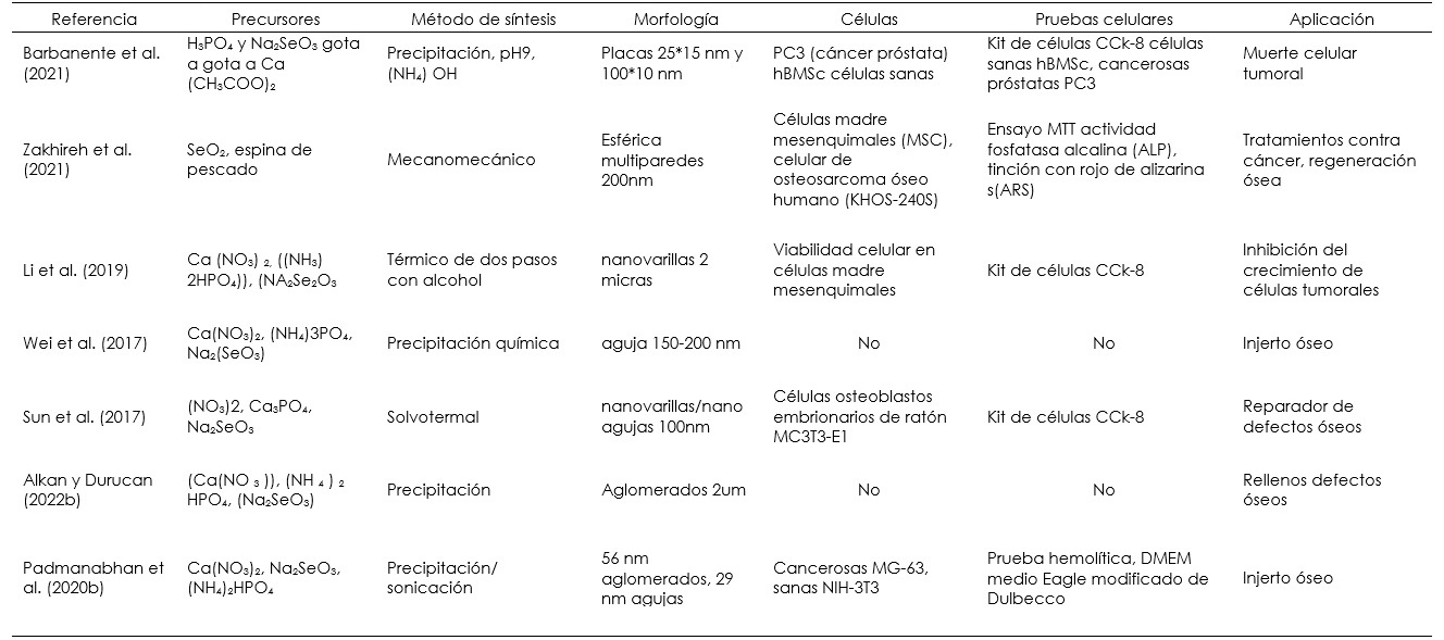 Incorporación estructural de Hap/Se. La Hap dopada con iones Se, principalmente, se obtiene a través de la síntesis; durante la cual los iones se incorporan a la estructura, como lo menciona Varun Prasath Padmanabhan et al. (2020) usaron los métodos de precipitación química y por sonicación, sintetizaron compuestos de Hap sustituidos por Se. Los análisis espectroscópicos FTIR y Raman confirmaron el dopaje exitoso de Se en la matriz de Hap y con el análisis de DRX indicaron su alta cristalinidad; el análisis morfológico indicó que por el método sonoquímico se produjeron partículas en forma de bastoncillos; mientras que por el de precipitación se presentaron partículas con estructuras aglomeradas (Padmanabhan et al., 2020). En la tabla 3 se resumen algunos trabajos recientes sobre la síntesis de Hap/Se y las pruebas biológicas realizadas en este material.