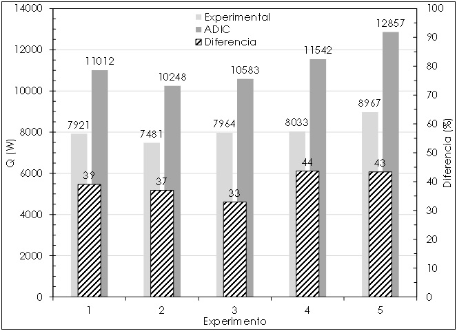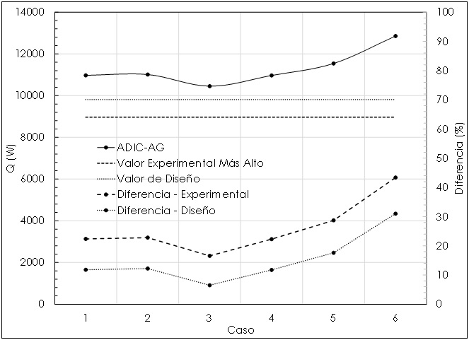 Cualquiera de las combinaciones mostradas en la tabla anterior arrojó valores de Q mucho mayores a los obtenidos experimentalmente (tabla 5), representando una mejora de desempeño, en combinación con valores de ∆p semejantes a algunos de los registrados en los experimentos. Es decir, se pudo incrementar la capacidad del intercambiador de calor sin tener que incurrir en un aumento relevante en ∆p, lo cual es ventajoso considerando que es deseable que dicho parámetro se mantenga lo más bajo posible. El resto de los parámetros de relevancia se mantuvieron en valores que están dentro de lo que puede considerarse normal. La figura 9 muestra el incremento en el valor de Q pronosticado por los cálculos de los algoritmos ADIC-AG, en comparación con los valores más altos obtenidos con el paquete de diseño y en los experimentos.
