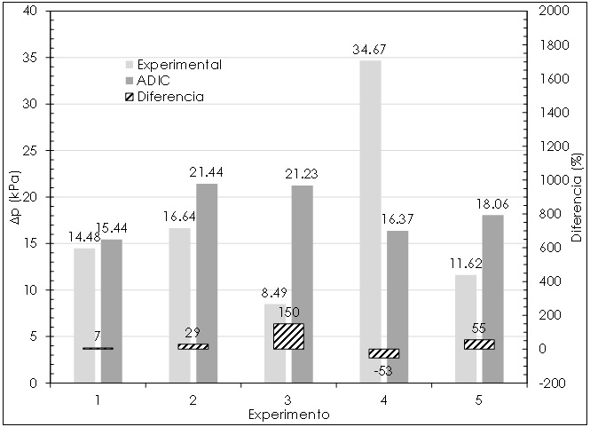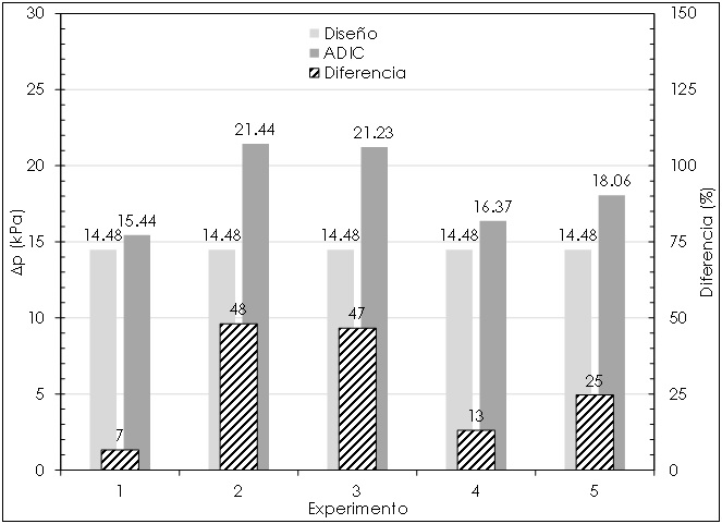 Las pruebas experimentales realizadas en la empresa estuvieron rodeadas de amplias diferencias en sus condiciones; lo que provocó una variabilidad importante en los resultados, arrojando desviaciones estándar equivalentes a 7% y 55% de los valores promedio de Q y ∆p, respectivamente. En este sentido, otros autores (Liu et al., 2023) han reportado valores obtenidos experimentalmente empleando instalaciones de laboratorio; en las cuales normalmente se tiene un mayor control de su funcionamiento; lo que no necesariamente ocurre con las instalaciones industriales, como las empleadas en el presente estudio. Por tanto, la comparativa de resultados obtenidos con el ADIC contra los de estas pruebas experimentales pueden, en principio, ser considerados como no satisfactorios. En contraparte, la comparativa de lo obtenido con el ADIC contra lo obtenido del paquete comercial de diseño, cuando para ambos casos se trató de reproducir las condiciones de los experimentos mostró una concordancia mucho mejor, con una diferencia promedio de 15% en el valor de Q, aunque en el caso de ∆p la diferencia promedio fue de 28%. Por tanto, se consideró que el ADIC cumple con el propósito planteado.