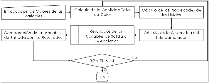 La secuencia de acciones del ADIC desarrollado en este trabajo corresponde exactamente con la presentada por Cao (2010) para enfriadores de aire. Se trata de un procedimiento iterativo que parte de un diseño inicial propuesto de intercambiador, en el cual se van modificando diversas variables geométricas y de operación; así como propiedades de los materiales involucrados, hasta llegar a una configuración que cumpla con un criterio establecido; este procedimiento se muestra de manera esquemática en la figura 2.
