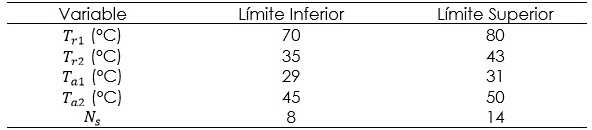 El AG está ligado al ADIC para utilizarlo como Función Objetivo; en esta relación, el AG introduce en el ADIC diversas combinaciones de valores de las variables más relevantes, almacenando los resultados que este último arroja como resultado para cada una de esas combinaciones para compararlos entre sí, seleccionar los mejores según los criterios establecidos y lograr así la optimización del intercambiador de calor tipo serpentín. Las variables de entrada elegidas como las más relevantes para la exploración por parte del AG son: Tr1, Tr2, Ta1, Ta2 y Ns, las cuales fueron definidas en la tabla 1. Las variables a optimizar son el calor transferido (Q) y la caída de presión (∆p), expresadas a través de la relación Q⁄∆p, así como el Npr; otros valores obtenidos y reportados por el AG son: EU, el número de circuitos (Nc), así como la temperatura de salida del aire recalculada Ta2,rec. Un aspecto relevante acerca de las variables de entrada para exploración es que estas se restringen a rangos de valores que tienen estricta correspondencia con el mundo físico, de modo que su combinación óptima obtenida por el AG tendrá un significado realista. En la tabla 3 se muestran los rangos empleados de dichas variables de entrada.