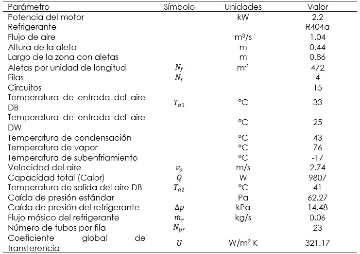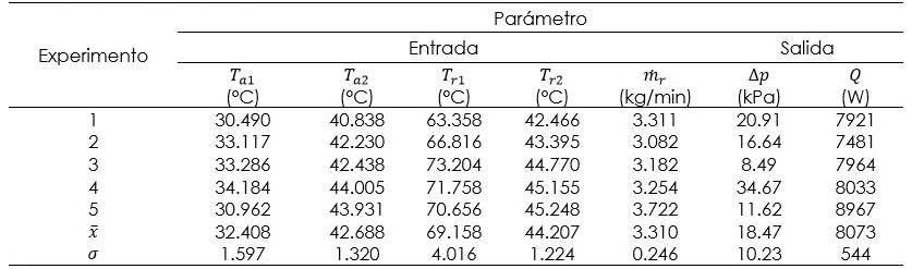 Con el ADIC se realizaron algunos cálculos iniciales empleando diferentes expresiones publicadas en la literatura para la estimación del coeficiente hi (Cao, 2010), con la intención de replicar los valores de los parámetros principales obtenidos con el paquete de diseño: capacidad total, coeficiente global de transferencia y número de tubos por fila); empleando la Ecuación (1), los valores obtenidos de esos parámetros fueron los que mejor concordancia tuvieron con los de diseño: capacidad total de 8899 W, coeficiente global de transferencia de calor de 358.03 W/m2 K y número de tubos por fila de 16; por lo que se adoptó esa expresión para h_i para los cálculos posteriores. Adicionalmente, en instalaciones de la misma empresa se realizaron pruebas experimentales en intercambiadores de calor, tratando de replicar las condiciones de entrada empleadas en los cálculos de diseño con el paquete comercial. Los datos de dichas pruebas corresponden a cinco experimentos realizados en días diferentes, buscando tener en los experimentos del 2 al 5 las mismas condiciones del experimento 1, en donde algunos de los valores de sus parámetros se corresponden con los mostrados en la tabla 4. En la tabla 5 se muestran en forma de resumen los valores promedio en el tiempo, durante la realización de las pruebas, de los principales parámetros de entrada y salida de esas pruebas.