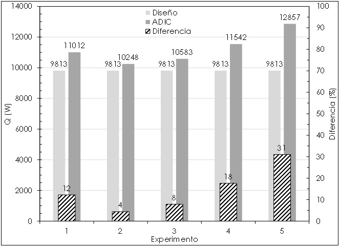 Resulta evidente de los valores mostrados en las dos figuras anteriores que, en términos generales, la correspondencia entre los experimentales y los calculados no es tan buena como se quisiera. No obstante, vale la pena destacar que los parámetros de los experimentos son promedio, ya que el nivel de variación (oscilación) observado durante esas pruebas fue notorio, lo que dificulta el poder reproducirlos con exactitud en los cálculos. En consecuencia, para establecer si el ADIC puede realmente ser de utilidad para los fines buscados, se realizó ahora una comparación de sus valores con los de diseño obtenidos con el paquete comercial; en las figuras 7 y 8 se muestran dichas comparativas.