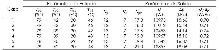 Los cálculos realizados con el AG, en conjunto con el ADIC, arrojaron varias combinaciones con valores mejorados de los parámetros de salida relevantes y, en consecuencia, el desempeño teórico del intercambiador de calor. En la tabla 6 se muestran las mejores combinaciones de parámetros de entrada, con sus respectivos valores de los parámetros de salida.