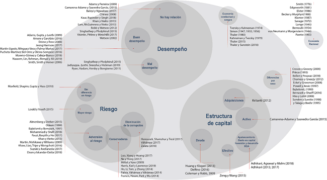 Para ello se realizó una búsqueda estructurada de artículos académicos indexados en Clarivate y Google Scholar. Se utilizaron los criterios: “sex differences in decision making”, “gender differences in decision making”, “gender differences in corporate financial decision, risk attitudes”, “gender differences in corporate financial decisions”, “gender differences in corporate financial performance”, “gender differences in capital structure”. La Figura 1, ilustra sobre los artículos encontrados y los autores en cada una de las dimensiones de la revisión de literatura realizada.