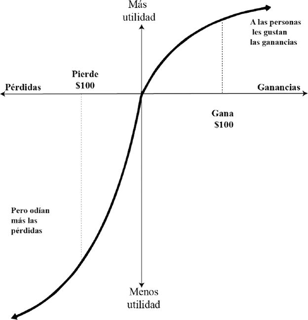 La función de valor propuesta por Kahneman y Tversky (1979), está definida sobre las desviaciones respecto al punto de referencia, la intersección de los ejes. Por lo tanto, el valor debe tratarse como una función en dos argumentos: la posición en la cual se encuentra, que sirve como punto de referencia, y la magnitud del cambio (positivo o negativo) respecto de ese punto de referencia (Kahneman y Tversky, 1979). Como se observa en la Figura 2, en la zona de ganancias las personas son adversas al riesgo, y la función es cóncava -con cada unidad más de ganancias el incremento en el valor es menor-. En la zona de pérdidas las personas muestran atracción por el riesgo y la función es convexa -con cada unidad más de pérdida, la disminución del valor es menor-. Thaler (2015) supuso que el hecho de que el dolor de una pérdida sea mayor al placer por una ganancia, aunque se trate de un mismo valor monetario, se llama aversión a la pérdida. Así que, bajo un panorama de ganancias las personas son adversas al riesgo y prefieren la certidumbre; mientras que, bajo un panorama de pérdidas, buscan el riesgo, aunque conlleve incertidumbre.