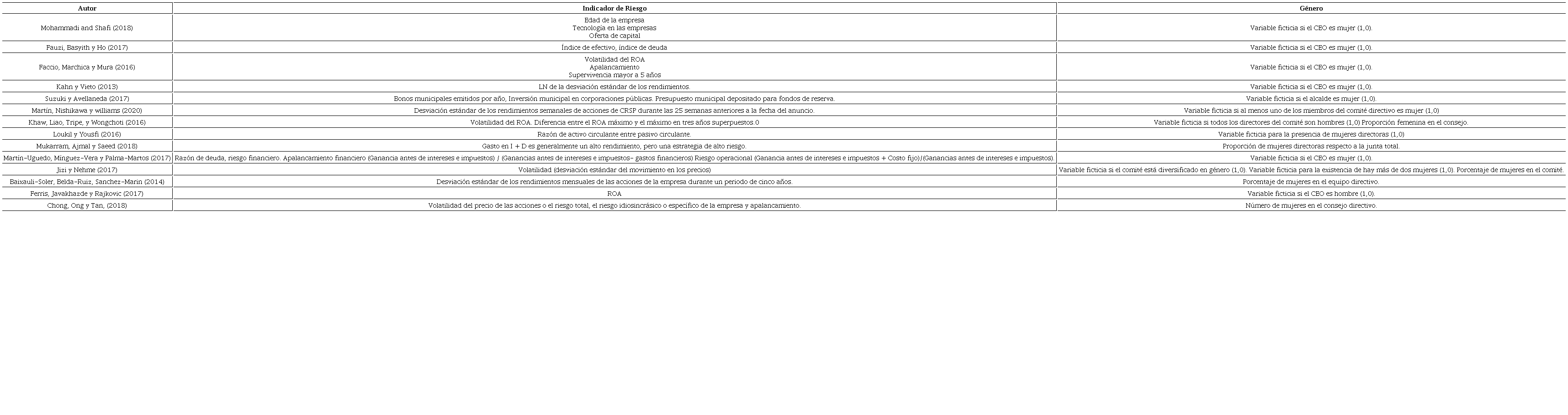 El Cuadro 1 presenta evidencia de la medición del riesgo en estudios sobre la presencia de mujeres directoras. Para la determinación de los diferentes indicadores de riesgo se han usado diferentes variables. Varias investigaciones que miden el riesgo -aunque no necesariamente midan el riesgo causado por diferencia de sexo-han usado como medida de riesgo la volatilidad de las ganancias como, por ejemplo, en Koirala et al., (2020); Kusnadi, (2015); Fauzi, Basyith y Ho (2017) y Khaw et al., (2016). Al hablar de ganancias, otros estudios han preferido usar como indicador de las ganancias el Retorno sobre Activos (ROA), como Ferris, Javakhadze y Rajkovic (2017) y Faccio, Marchiva y Mura (2016). Mientras Chong, Ong y Tan, (2018) para analizar el riesgo en la composición de los comités directivos, utilizan el apalancamiento.