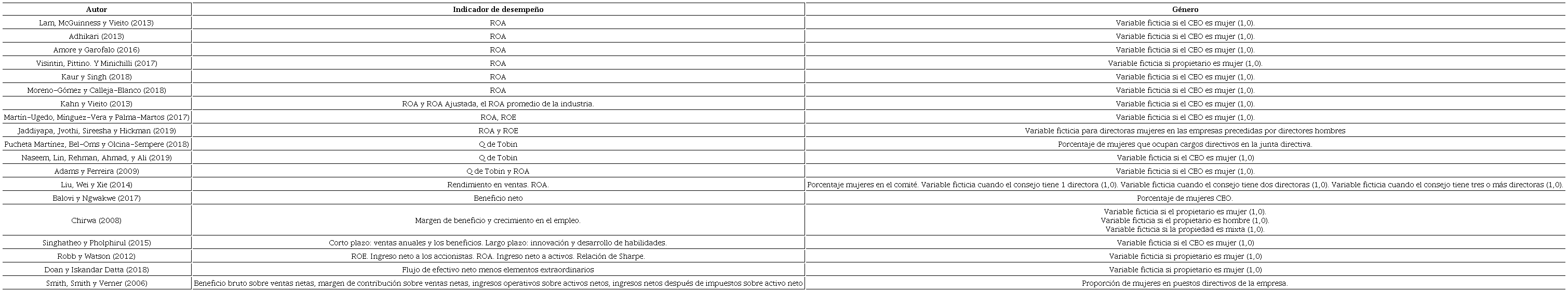 Mientras que Smith, Smith y Verner (2006) usan cuatro medidas de desempeño: beneficio bruto sobre ventas netas, margen de contribución sobre ventas netas, ingresos operativos sobre activos netos, ingresos netos después de impuestos sobre activo neto, y Adams y Ferreira (2009); Dezso y Ross (2008) y Pucheta-Martínez, Bel-Oms y Olcina-Sempere (2016), la Q de Tobin.