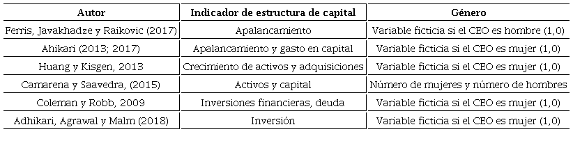 Bajo la postura de la literatura que asume que las mujeres son más adversas al riesgo, se considera que esto puede influir en la manera en que las empresas dirigidas por mujeres distribuyen su estructura de capital. En Indonesia, Kritanti (2012) encontró que los hombres ejecutivos realizan mayores adquisiciones y adquieren más deuda que las mujeres, lo que se traduce en retornos 2% menores que en las empresas lideradas por mujeres y las emisiones de deuda anuncian menor retorno para empresas con hombres ejecutivos (Huang y Kisgen, 2013), utilizando la base de datos Electronic Data Gathering, Analysis and Retrieval (EDGAR) de la Securities and Exchange Commission (SEC). Delfino (2016), usando datos de las empresas de la Bolsa de Valores en Chile, Perú y Colombia encontró evidencia de una relación de exceso de confianza de los hombres y el nivel de deuda. Además, en el emprendimiento, las mujeres inician sus negocios con menor nivel de activos y capital que los hombres, por ejemplo, en México (Camarena y Saavedra, 2015).