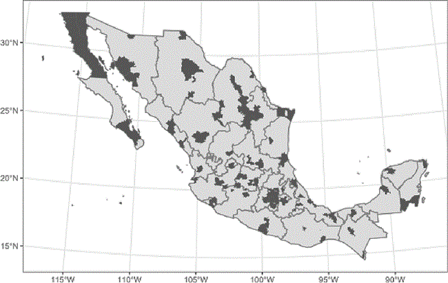 Para delimitar las áreas de las diferentes zonas metropolitanas se utilizó la delimitación definida conjuntamente por la Secretaría de Desarrollo Agrario, Territorial y Urbano (SEDATU), el Consejo Nacional de Población (CONAPO) y el Instituto Nacional de Estadística y Geografía (INEGI)5, definidas como el conjunto de dos o más municipios donde se localiza una ciudad de 100 mil o más habitantes; cuya área urbana, funciones y actividades rebasan los límites del municipio, incorporando dentro de su área de influencia directa a municipios vecinos, predominantemente urbanos, con los que mantiene un alto grado de integración socioeconómica. Adicionalmente, se incluyen las capitales de los estados que no cumplan con el criterio anterior. Cabe mencionar que esta selección de municipios ha cambiado en el tiempo, agregándose nuevas municipalidades a medida que crecen las zonas urbanas. Por este motivo, se analizan los municipios de las zonas metropolitanas definidas en el año 2015, que es la delimitación más reciente al momento de la realización de este trabajo. Una vez derivado el listado, se obtuvo la georreferencia de los municipios por medio del mapa geoestadístico del INEGI. El Mapa 1 muestra la ubicación geográfica obtenida de las zonas metropolitanas a lo largo del territorio nacional. De acuerdo con esta delimitación, existen 74 zonas metropolitanas distribuidas a lo largo del territorio mexicano.