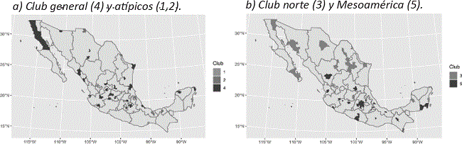 Con respecto a la distribución geográfica de los clubes, se observan resultados interesantes. Primero, la existencia de un club que está presente a lo largo de todo el país, de punta a punta del territorio nacional. Se trata del club 4, que no solo es el que tiene más elementos, sino también el que está más uniformemente distribuido en el espacio (ver Mapa 2.a). Por otro lado, existen dos clubes que dividen en dos al país. El club 3 que se presenta principalmente en el norte del país, con solo dos excepciones en Querétaro y Campeche; y el club 5, que por su distribución recuerda a la región cultural mesoamericana (ver Mapa 2.b). En cuanto a los dos clubes restantes, que en conjunto agrupan solo el 10% de las zonas metropolitanas, parecen agrupar a las zonas atípicas; es decir, que agrupa pocos elementos y tienen un comportamiento característico muy diferente a los demás.
