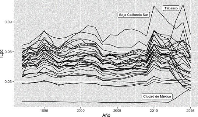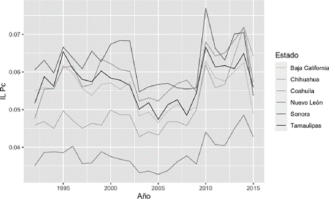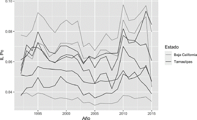 Desagregando los datos de las áreas metropolitanas pero agrupados por estado (Gráfica 2), se observa que el comportamiento no es homogéneo entre los estados, como lo mencionan Rodríguez-Benavides et al. (2016), al identificar seis diferentes grupos cuando analizan el ingreso estatal. Si bien el trabajo mencionado saca a relucir dichas diferencias, estas no son del todo obvias. Por ejemplo, la franja de los estados fronterizos del norte, agrupación tradicionalmente utilizada dentro de la literatura, sale a relucir desde inspecciones meramente visuales, como la de Sanén y Romero (2010), hasta bajo el análisis de desempeño como el de Brida et al. (2013), que clasifican estos estados como integrantes del grupo denominado de alto desempeño. De hecho, si observamos los datos, se identifica la similitud en el comportamiento del índice ILpc para las zonas metropolitanas pertenecientes a dichos estados (Gráfica 3), donde las diferencias son en su mayoría solo de nivel.