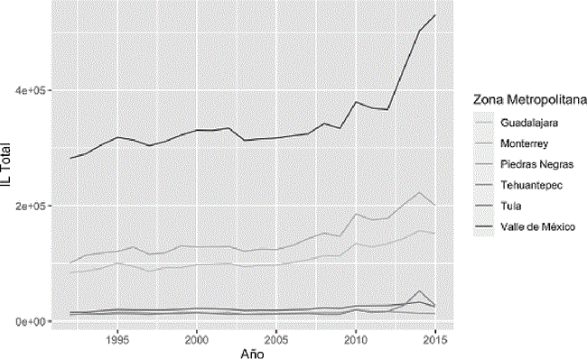 En promedio, las tres áreas con mayor IL para el periodo 1992-2015 son: el Valle de México, en la Ciudad de México (anteriormente Distrito Federal); el área metropolitana de Monterrey, en Nuevo León; y el área metropolitana de Guadalajara, en Jalisco (Gráfica 5). De manera opuesta, las zonas con los índices más bajos son: Teziutlán, en Puebla; Moroleón-Uriangato, en Guanajuato; y Acayucan, en Veracruz. Es importante mencionar que estas zonas no están ubicadas en la franja fronteriza del sur como se habría esperado. Por otra parte, al controlar el IL por habitante, dos de las tres zonas metropolitanas con mayor IL presentan el menor ILpc promedio; es decir, el Valle de México y Guadalajara, además de Xalapa en Veracruz. Por el contrario, los mayores ILpc los presentan Piedras Negras, en Coahuila; Tehuantepec, en Oaxaca; y Tula, en Hidalgo (Gráfica 6). En general, llama la atención la presencia de Tehuantepec6, ya que por lo regular las regiones del sur del país han estado históricamente asociadas a bajos niveles de desarrollo. Sin embargo, al hacer el análisis más detallado es posible detectar comportamientos que no surgen en el agregado y que pueden suponer casos de éxito bajo el contexto particular de esas regiones. Las Gráficas 5 y 6 presentan las zonas metropolitanas con valores máximos respecto al IL y el ILpc. En particular, estas gráficas muestran el grupo GmaxIL de las tres zonas metropolitanas con mayor IL y el grupo GmaxILpc de las zonas metropolitanas con mayor ILpc. Es relevante el análisis que se puede desprender de la interpretación de esta razón, tanto desde la perspectiva de bienestar como de una de productividad. Si bien no está dentro del alcance de este estudio, consideramos que podría dar pie a trabajos futuros.