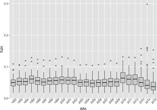 Por último, el Cuadro 1 muestra los estadísticos descriptivos del ILpc para el periodo 19922015. La primera columna corresponde al año de la observación, la segunda a la media para ese año, la tercera muestra la varianza y las restantes presentan los cuartiles uno, dos y tres que se usaron en la Gráfica 7, donde el segundo cuartil corresponde a la moda de los datos. De acuerdo con el cuadro, se observa que la media del ILpc para cada año fluctúa alrededor del 0.05, mientras que la varianza muestra un comportamiento estable a través del tiempo, con excepción del año 2014.