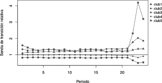 En la Gráfica 8 se observa un cambio en el comportamiento a partir del periodo 22, que corresponde al año 2013, donde los datos fueron capturados con la tecnología más moderna. Con la finalidad de evaluar el efecto que tiene esa sección de la serie sobre los resultados, se aplicó el algoritmo sobre la serie truncada. Es decir, se eliminaron los datos de 2013 a 2015. Los resultados se muestran en el Cuadro 5 donde resaltan dos puntos: la existencia de un elemento divergente y el signo positivo de para tres de los cinco clubes. Con respecto al elemento divergente, éste es aún más interesante al tratarse de la zona metropolitana del Valle de México, la cual ha sido utilizada como líder en estudios de convergencia (Ayala et al., 2011). Si bien fue utilizada desde una perspectiva de entidad federativa y no desde la perspectiva de una zona metropolitana, no deja de llamar la atención este resultado. En principio, es complejo que la totalidad de las entidades se acerquen al desempeño de la capital, dadas las condiciones de infraestructura y el tipo de actividades económicas predominantes en la zona, razón por la cual es importante analizar las dinámicas de crecimiento de manera diferenciada.