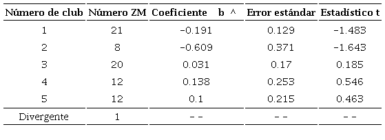 Finalmente, entre los resultados obtenidos, resalta el hecho de que todos los clubes están lejos de presentar un proceso de convergencia absoluta, ya que para ningún club el estimador es positivo. Además, el hecho de que se presenten valores cercanos a cero indica un proceso de convergencia lento. Esto es consistente con algunos resultados en la literatura que dan cuenta de un proceso de convergencia débil (Esquivel, 1999; Cermeño, 2001; Chiquiar, 2005 y Rodríguez-Oregia, 2005).