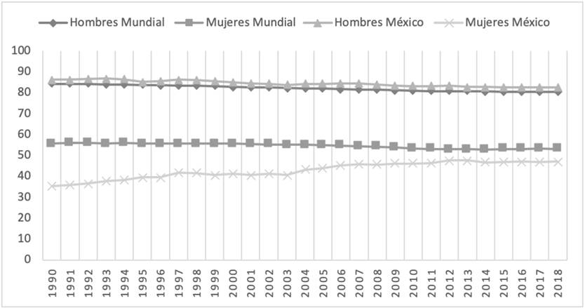 Para el caso de México, si bien la evidencia empírica indica la presencia de la mujer en el mercado laboral en menor magnitud e inferiores salarios en comparación con los varones, estas cifras se han incrementado a favor de las mujeres desde la década de los noventa y continúan con una tendencia creciente. Esta participación femenina se ha comportado de manera contraria a la tendencia mundial en el periodo de 1990 a 2018, exhibiéndose un aumento de 11.82 puntos porcentuales, pasando del 35.27% al 47.09%.