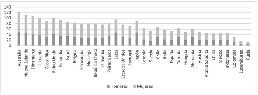 Respecto a la educación, el promedio de escolaridad general en México para el 2015 fue de 9.1 años, siendo para las mujeres de 9 años y para los hombres de 9.3 años. A su vez, con información de la Organización para la Cooperación y el Desarrollo Económico (OCDE, 2021), en la Figura 2 se presenta la tasa de graduación en educación terciaria6 por sexo para los países miembros, en donde se observa que México es el quinto país más bajo en las tasas de graduación para esta etapa académica; sin embargo, la brecha entre hombres y mujeres no favorece al sexo masculino. En la mayoría de estos países, la brecha en educación terciaria entre hombres y mujeres es mínima, incluso en algunos casos las mujeres tienen tasas de educación terciaria mayores que los hombres. Pese a esto, los hombres siguen teniendo mayor participación laboral que las mujeres.