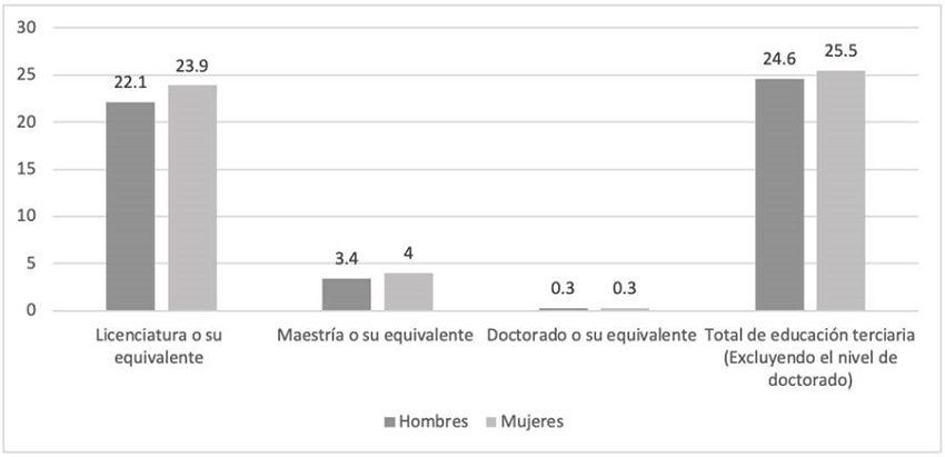 En el caso específico de México, se observa un escenario similar. La tasa de participación femenina tiene niveles muy inferiores en comparación con la respectiva tasa masculina. Sin embargo, al analizar la brecha educativa en escolaridad terciaria, la Figura 3 muestra que, para el nivel licenciatura o maestría, el porcentaje de mujeres fue mayor que el de los hombres en el año 2016.