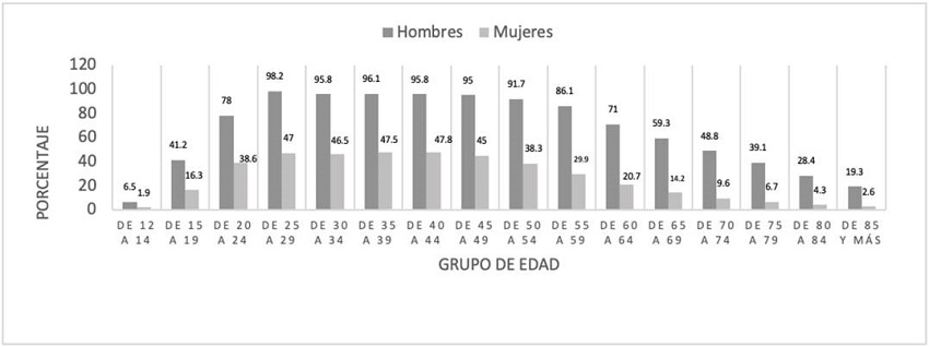 En cuanto a la edad, es evidente cómo la participación económica para ambos sexos se modifica cuando se segmenta la participación por grupos de edad. En la Figura 4 se observa el incremento de la brecha de participación entre hombres y mujeres a partir de 20 a 24 años, y se mantiene constante hasta llegar aproximadamente a los 65-69. Para ambos sexos se encuentra una disminución en la fuerza laboral a partir de los 70 años, sin embargo, los niveles de participación femenina en ninguna edad logran equiparar los niveles de la participación masculina.