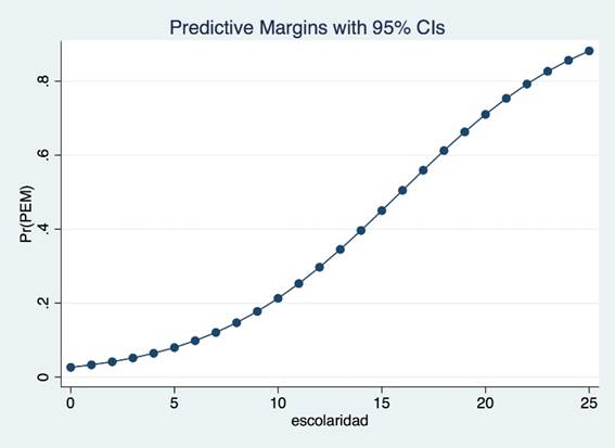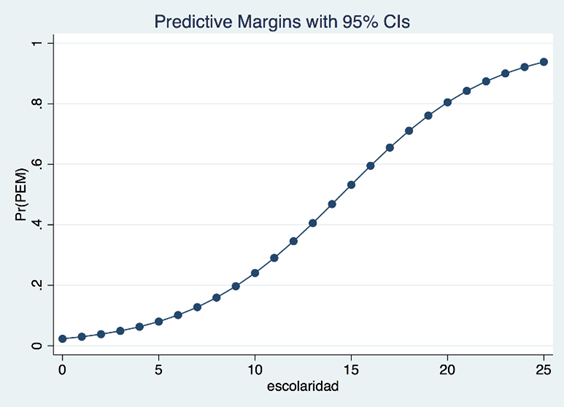 Como preámbulo a los resultados de la segunda etapa de análisis, y con base en la discusión referente al capital humano y la PEM, se presentan las Figuras 5 y 6, las cuales muestran la relación entre la escolaridad y la probabilidad de la mujer de estar ocupada. Se observa que, si bien la probabilidad es creciente con la educación, estos incrementos se muestran decrecientes después de los 15 años de escolaridad (equivalente a nivel licenciatura). Por lo tanto, a mayor escolaridad, mayor probabilidad de participación del empleo formal femenino. Para más detalle, el Cuadro 2 muestra la probabilidad de trabajar asociada a cada año de escolaridad de la mujer, mostrando que la relación es creciente hasta el nivel universitario, y después de éste, la contribución es marginal.