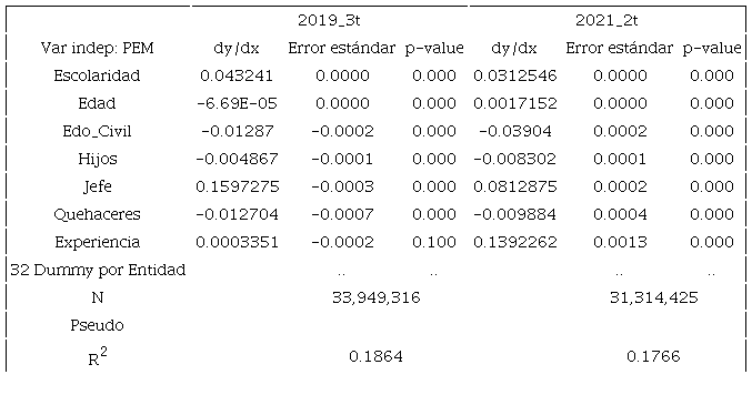 Por su parte, la estimación con base en (1) a través del modelo logit, para los datos más recientes disponibles para la ENOE 2021, se logra después de 5 iteraciones, resultando correctamente clasificadas el 80.2% de las observaciones.