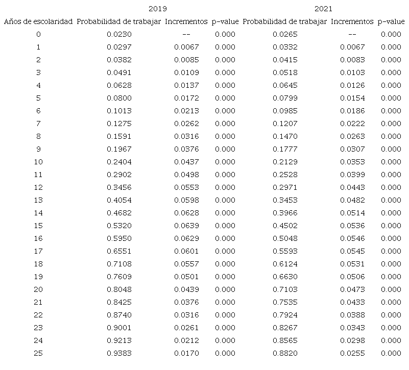 En comparación con el año 2019, el principal cambio observado se registra en la experiencia, pasando del 0.034% al 13.92% en el año 2021. Esto es que, si la mujer dispone de experiencia laboral, incrementa en promedio la probabilidad de estar en el mercado de trabajo en cerca del 14%. Esto podría estar asociado con las modificaciones en el mercado laboral, derivadas de la crisis por COVID-19, donde se incrementó el desempleo y, por tanto, permanecieron ocupadas las mujeres con experiencia, tanto por los costos asociados al despido, así como por la importancia de la experiencia profesional.