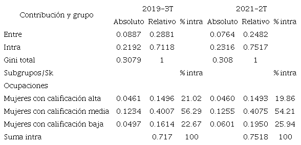 Por su parte, la descomposición de la desigualdad salarial permite observar, por grupo de habilidad, las diferencias en los ingresos percibidos por las mujeres. Con esta información será posible analizar cómo la escolaridad es determinante en los ingresos que perciben las mujeres en el mercado laboral.
